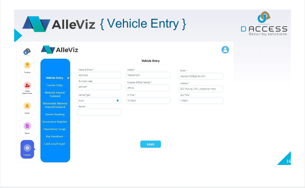 Real-time entry tracking with driver details, vehicle type, purpose of visit (official/personal), in/out timing, and instant reporting.