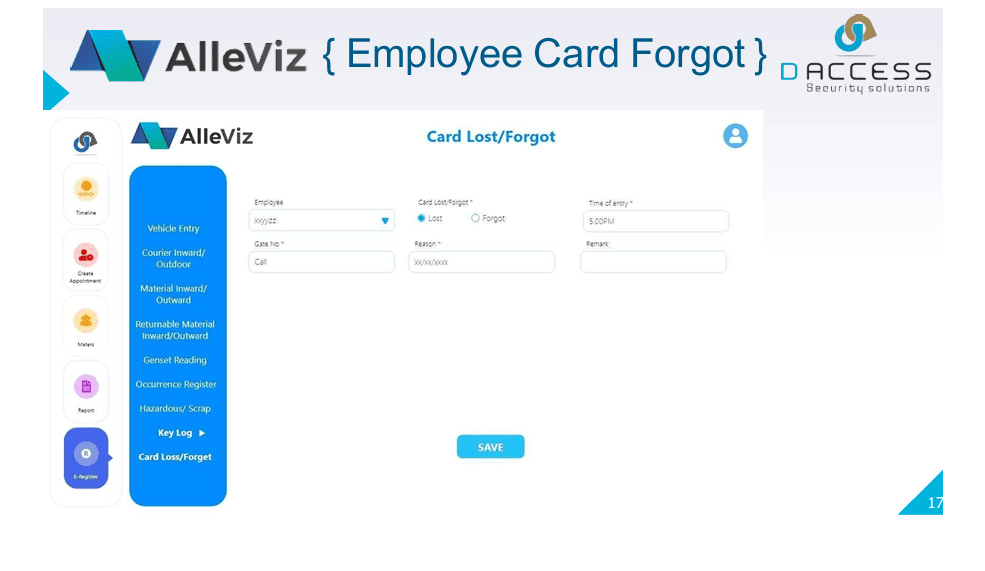 Card loss/forgot features with immediate logging of time, entry gate, and remarks.