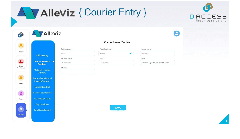 Digital registration of courier inbound/outbound with sender/receiver info, time, remarks, and delivery agency details.